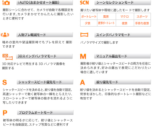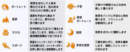 撮影シーンに応じてモードを選択するだけで、カメラが自動的に絞りやシャッタースピードはもちろん、ホワイトバランスや画質まで、シーンに最適になるようコントロールします。「ポートレート」「風景」「マクロ」「スポーツ」「夕景」「夜景ポートレート」「夜景」「手持ち夜景」モードの8種類から選択できます。