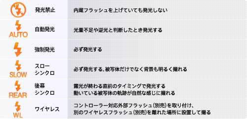 焦点距離18mm(*)までの画角をカバーする、ガイドナンバー6(ISO100・m)の内蔵フラッシュを搭載。フラッシュモードは、「自動発光」のほか、雰囲気のある夜景ポートレートが撮れる「スローシンクロ」、動きの軌跡を表現できる「後幕シンクロ」や「強制発光」「発光禁止」「ワイヤレス」を搭載しています。