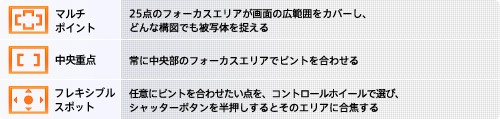 25点のフォーカスエリアが画面の広範囲をカバーし、どんな構図でも被写体をとらえる「マルチポイント」。画面中央のみでピントを合わせる「中央重点」。 ユーザーが任意にピントを合わせる位置を指定できる「フレキシブルスポット」。3種類のフォーカスエリアから、被写体や構図にあわせて選択できます。