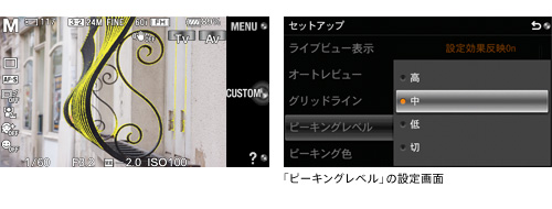 マニュアルフォーカス時に、画面内のシャープな部分を色つきで表示します。液晶モニターはもちろん、ファインダー内でもどこにピントが合っているかが一目で確認でき、細かなピント合わせを行うマクロやポートレート撮影に便利です。ピーキングの色は白、赤、黄色から選べ、ピーキングレベルは3段階から選択できます。また、Aマウントレンズ(*)を装着している際にも活用できます。
