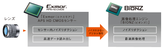 「Exmor(エクスモア) 」 APS HD CMOSセンサーには、ノイズの発生を最小限に抑えるソニー独自の技術を採用。1画素あたりの感度を高めつつノイズレベルを大幅に低減しています。さらに、画像処理エンジン「BIONZ(ビオンズ)」の働きが加わることで、高画素化しながらも高感度ISO12800を達成し、暗いシーンでもノイズの少ないクリアな画質を実現しています。