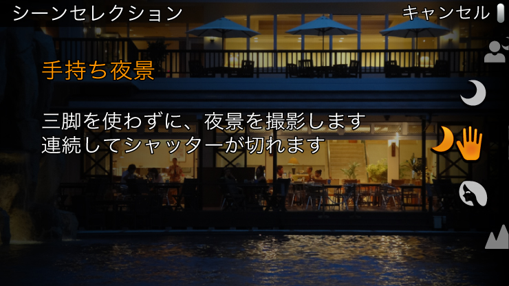 ノイズを抑えてキレイな夜景が撮れる「手持ち夜景」モード