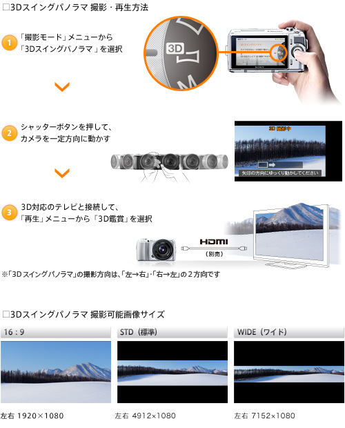 「スイングパノラマ」の技術を活用することで3D写真を撮影できる「3Dスイングパノラマ」。シャッターボタンを押した後カメラを一振りするだけで、高速連写した最大60枚の画像を、カメラ内で左右の目の視差を計算しながら合成し、右目用と左目用の2枚の画像を同時に作成します。自動作成された画像は、カメラと3D対応のテレビをHDMIケーブルで接続すれば、臨場感あふれる3D写真として鑑賞できます。