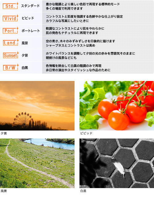 画像の仕上がりを自分のイメージに合わせて設定できる「クリエイティブスタイル」機能を搭載。「スタンダード」「ビビッド」「ポートレート」「風景」「夕景」「白黒」の6種類のモードから選択すれば、カメラが自動で最適な画像処理と調整を行います。コントラスト、彩度、シャープネスそれぞれの微調整が可能です。動画撮影時にも、「クリエイティブスタイル」機能を設定できます。