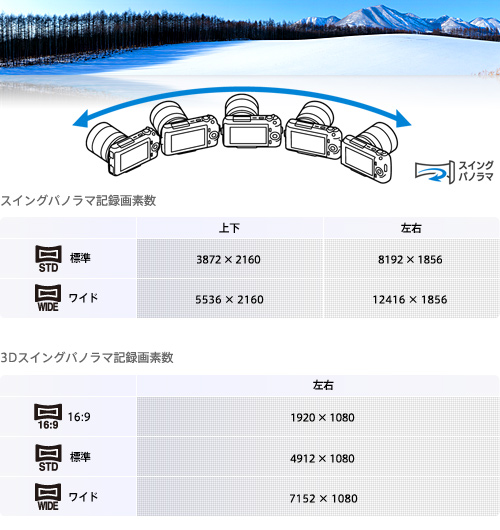 • ※ 「3Dスイングパノラマ」で撮影した画像をパソコンに取りこむと、MPOファイル(3D用)とJPEGファイル(2D用)の2つのファイルが、同じフォルダ内に保存されます
