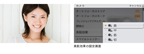 顔のシワやくすみを自動で美肌にする「美肌効果」モードを搭載。目や口元のシャープ感を保ったまま、顔の小ジワやくすみ感を軽減して美肌を表現します。最大8人まで検出でき、記念撮影にも便利。美肌効果は、低・中・高の3段階から選べ、P/A/S/Mモード時やマニュアルフォーカス時でも使用できます。