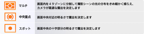 画面全体を49エリアに分割し、各エリアの測光データから適正な露出を決定する「マルチ測光」。画面中央部周辺に重点をおきながら全体の明るさを平均的に測光する「中央重点平均測光」、中央部のフォーカスエリア付近を測光する「スポット測光」から、好みやシーンに合わせて選択できます。シャッターボタンを半押しすることで、露出を固定できるAEロックも可能です。
