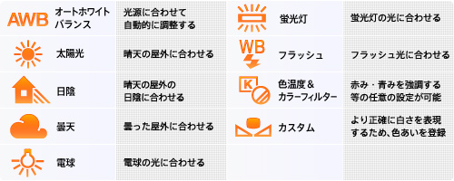「オートホワイトバランス(AWB)」に設定しておけば、カメラがシーンの光源を自動で判定して、色のバランスが最適になるよう調整します。そのほか、赤みや青みを強調したい場合には、「太陽光」「電球」「蛍光灯」などの6種のプリセットモードから選択できます。さらに「色温度&カラーフィルター」「カスタム」を使用して、表現に合わせて色彩を細かく調整できます。