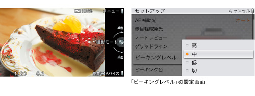 マニュアルフォーカス時に、画面内のシャープな部分を色つきで表示します。画面のどこにピントが合っているか一目で確認ができ、細かなピント合わせを行うマクロやポートレート撮影に便利です。ピーキングの色は白、赤、黄色から選べ、ピーキングレベルは3段階から選択できます。また、別売のマウントアダプターでAマウントレンズを装着している際にも活用できます。