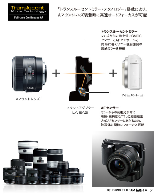 ソニー独自開発の「トランスルーセントミラー・テクノロジー」を搭載した、マウントアダプターLA-EA2(別売)を使えば、すべてのAマウントレンズ(*)を装着可能です。さらに、静止画・動画を問わず、高速・高精度なTTL位相差検出方式AFが働くため、決定的な瞬間を逃さずとらえられます。広角から望遠まで豊富なαレンズ(Aマウントレンズ)を活用することで、表現の幅がさらに広がります。
