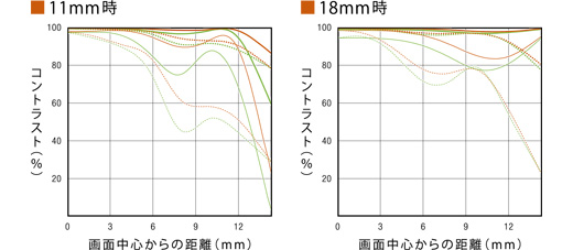 MTFはレンズのコントラスト再現性を示すレンズ性能評価方法のひとつ。撮像面上で画像がどれだけ被写体を忠実に再現しているかを、周波数特性で表現します。MTF特性図は、横軸が画面中心からの距離(mm)、縦軸がコントラストとなっており、また、MTF特性は代表的な空間周波数(10本/mm、30本/mm)について、方向(放射線状:R、同心円状:T)、絞り値(開放、F8)の条件により表されています。