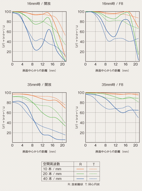 MTFはレンズのコントラスト再現性を示すレンズ性能評価方法のひとつ。撮像面上で画像がどれだけ被写体を忠実に再現しているかを、周波数特性で表現します。MTF特性図は、横軸が画面中心からの距離(mm)、縦軸がコントラストとなっており、また、ツァイスレンズのMTF特性は代表的な空間周波数(10本/mm、20本/mm、40本/mm)について、方向(放射線状:R、同心円状:T)、絞り値(開放、F8)の条件により表されています。