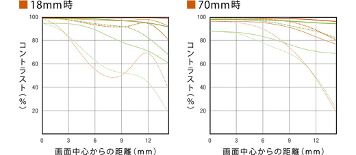 ※DTレンズは35mm判一眼レフカメラには使用できませんMTFはレンズのコントラスト再現性を示すレンズ性能評価方法のひとつ。撮像面上で画像がどれだけ被写体を忠実に再現しているかを、周波数特性で表現します。MTF特性図は、横軸が画面中心からの距離(mm)、縦軸がコントラストとなっており、また、MTF特性は代表的な空間周波数(10本/mm、30本/mm)について、方向(放射線状:R、同心円状:T)、絞り値(開放、F8)の条件により表されています。