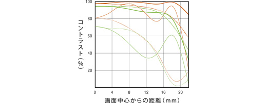 MTFはレンズのコントラスト再現性を示すレンズ性能評価方法のひとつ。撮像面上で画像がどれだけ被写体を忠実に再現しているかを、周波数特性で表現します。MTF特性図は、横軸が画面中心からの距離(mm)、縦軸がコントラストとなっており、また、MTF特性は代表的な空間周波数(10本/mm、30本/mm)について、方向(放射線状:R、同心円状:T)、絞り値(開放、F8)の条件により表されています。
