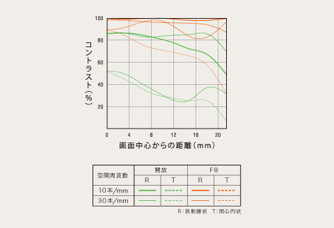 MTFはレンズのコントラスト再現性を示すレンズ性能評価方法のひとつ。撮像面上で画像がどれだけ被写体を忠実に再現しているかを、周波数特性で表現します。MTF特性図は、横軸が画面中心からの距離(mm)、縦軸がコントラストとなっており、また、MTF特性は代表的な空間周波数(10本/mm、30本/mm)について、方向(放射線状:R、同心円状:T)、絞り値(開放、F8)の条件により表されています。