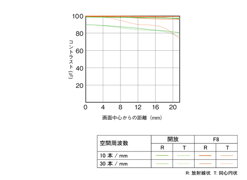 MTFはレンズのコントラスト再現性を示すレンズ性能評価方法のひとつ。撮像面上で画像がどれだけ被写体を忠実に再現しているかを、周波数特性で表現します。MTF特性図は、横軸が画面中心からの距離(mm)、縦軸がコントラストとなっており、また、MTF特性は代表的な空間周波数(10本/mm、30本/mm)について、方向(放射線状:R、同心円状:T)、絞り値(開放、F8)の条件により表されています。