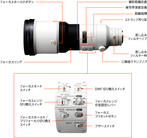 屋外での使用を考慮して、防塵・防滴に配慮した設計を採用。フォーカスホールドボタンは4カ所配置され、あらゆるホールディングスタイルでも瞬時にフォーカスホールドが可能。2方式のDMFモードやフォーカスレンジ切り換えやプリフォーカス機能など、操作性も徹底的に追求しています。また、遮光効果の高いカーボンファイバー製のレンズフードや90度ごとにクリックを備えた三脚座も装備しています。