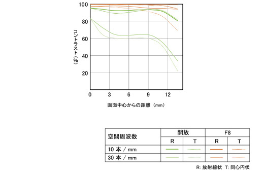 MTFはレンズのコントラスト再現性を示すレンズ性能評価方法のひとつ。撮像面上で画像がどれだけ被写体を忠実に再現しているかを、周波数特性で表現します。MTF特性図は、横軸が画面中心からの距離(mm)、縦軸がコントラストとなっており、また、MTF特性は代表的な空間周波数(10本/mm、30本/mm)について、方向(放射線状:R、同心円状:T)、絞り値(開放、F8)の条件により表されています。