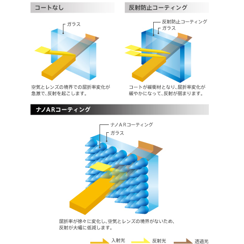 レンズの表面に入射した光は一定の割合で反射するため、その不要な反射光が画質を劣化させるフレアやゴーストの原因になります。ソニーが独自に開発したコーティング技術「ナノARコーティング」は、ナノサイズ(1ナノメートルは10億分の1メートル)の凸凹を規則的に並べた構造で、レンズ表面に境界面をなくして光の反射率を大幅に抑えます。このコーティングをレンズ面に施すことで、通常の反射防止コートと比較して約1/5という低い反射率を達成。不要な光の反射を極限まで低減し、内面反射によるフレアやゴーストを抑え、黒が締まったヌケの良いクリアな画質を実現しています。