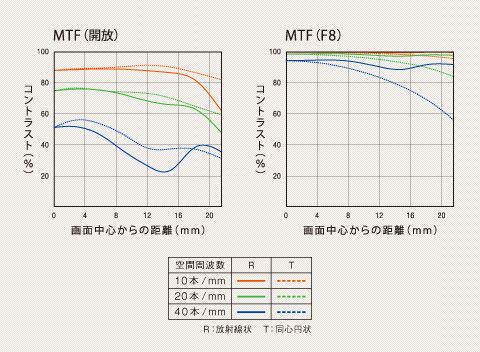 MTFはレンズのコントラスト再現性を示すレンズ性能評価方法のひとつ。撮像面上で画像がどれだけ被写体を忠実に再現しているかを、周波数特性で表現します。MTF特性図は、横軸が画面中心からの距離(mm)、縦軸がコントラストとなっており、また、ツァイスレンズのMTF特性は代表的な空間周波数(10本/mm、20本/mm、40本/mm)について、方向(放射線状:R、同心円状:T)、絞り値(開放、F8)の条件により表されています。