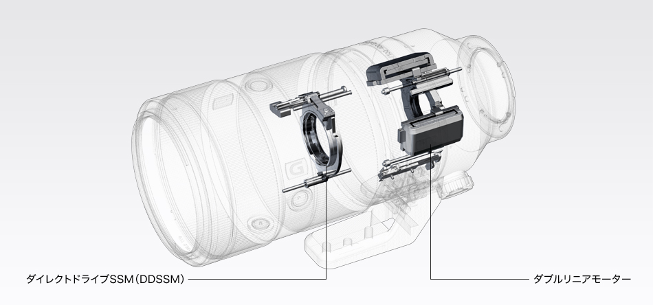 フォーカス駆動には、ダイレクトドライブSSM(DDSSM)とダブルリニアモーターを組み合わせたフローティング機構を初めて採用。最適化されたAFアルゴリズムと合わせて、素早い動き出しと被写体を捉えて離さないAF駆動を実現しています。