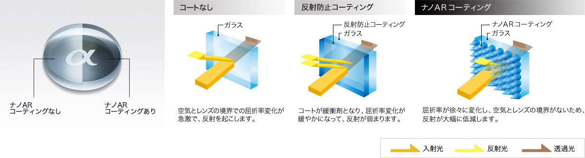 レンズ最前面にはフッ素コーティングを施し、指紋、ほこり、水滴、油、泥などが付きにくく、付着しても容易に拭き取れます。