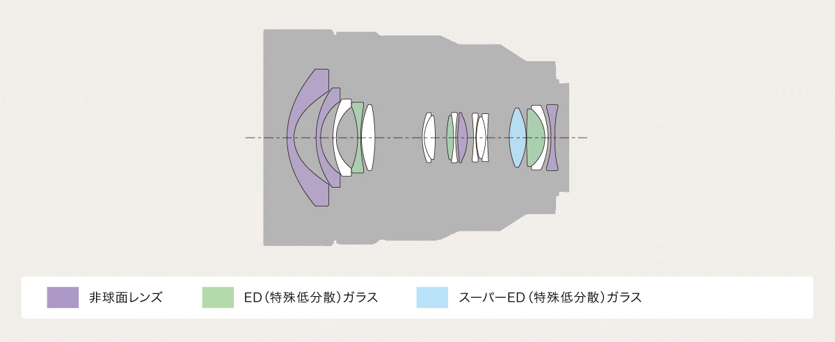 ED(特殊低分散)ガラス3枚、スーパーEDガラス1枚を最適に配置し、色収差を良好に補正。これにより画面周辺までクリアな描写を可能にします。