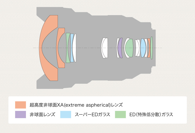 超高度非球面XA(extreme aspherical)レンズ3枚、非球面レンズ1枚を採用し、諸収差を徹底的に抑えた高い解像力を実現。最前面レンズにはαレンズ史上最大径のXAレンズを使用しています。