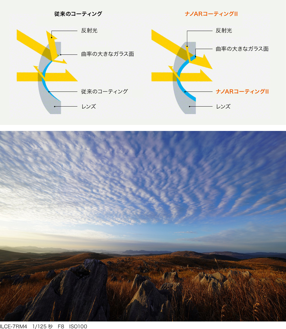 αレンズ史上最大径のXAレンズに合わせ、「ナノARコーティングII」を新開発。従来のナノARコーティングでは適用できなかった大口径や曲率の大きいレンズにおいても、レンズ全面に均一にコーティングを施すことが可能。太陽光などの強い光が入りこみやすい広角レンズでも、内面反射によるフレアやゴーストの発生を大幅に抑制し、ヌケの良いクリアな画質を実現します。