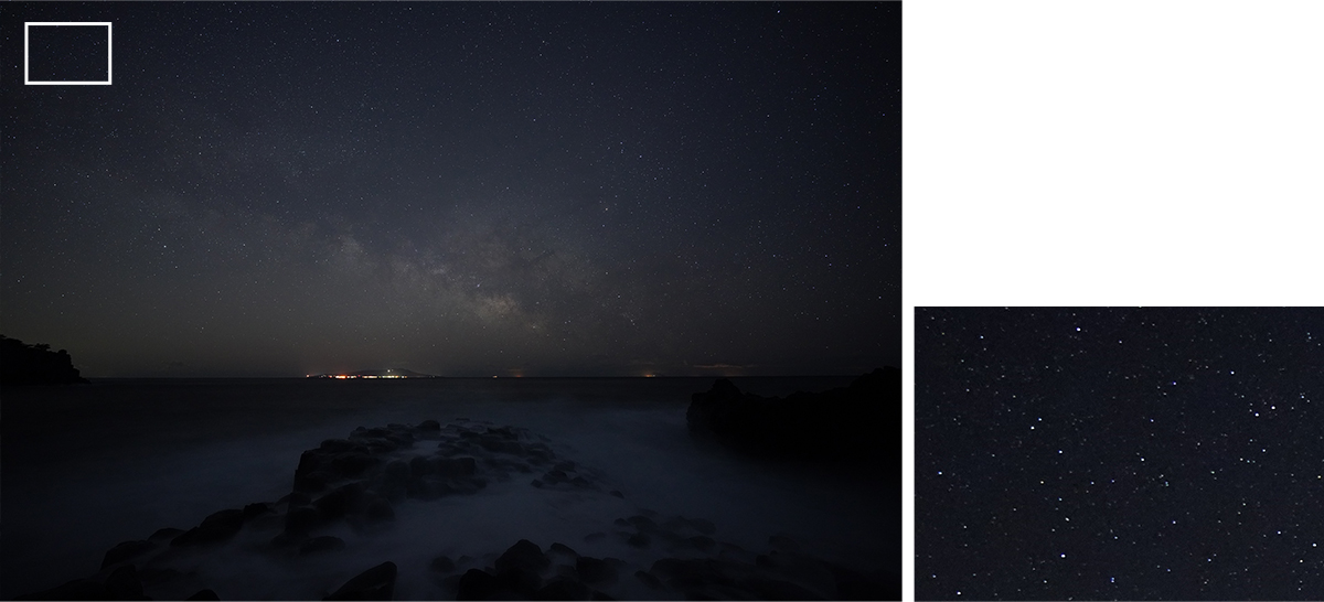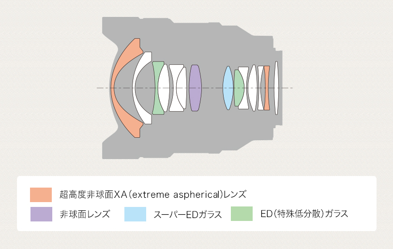 0.01ミクロン単位という高い精度で表面を製造管理している超高度非球面XA(extreme aspherical)レンズ2枚の採用など、最新の光学設計で画面全域で高い解像性能を実現しています。サジタルフレア(点光源の像のにじみ)を抑制した高い点像再現性を備えているため、特に夜景や星景撮影などで威力を発揮します。