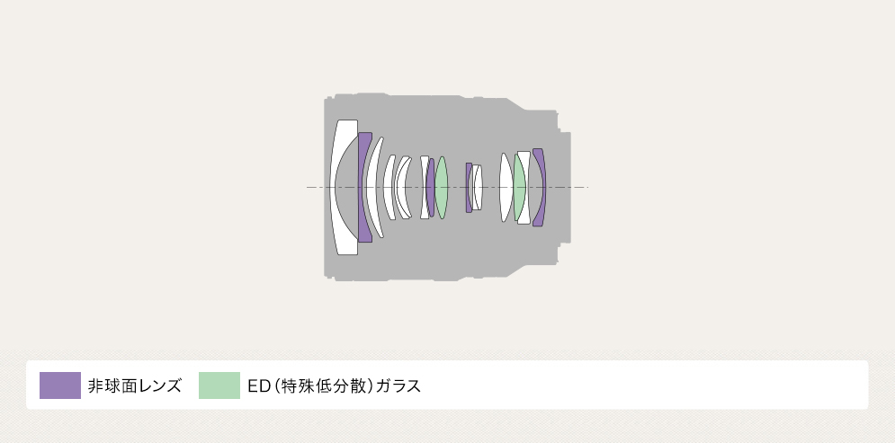 最新の光学設計により、画面中心から周辺部分まで高い解像性能を実現しました。4枚の非球面レンズと2枚のED(特殊低分散)ガラスを効果的に配置することで、色収差など諸収差を低減。フレア、ゴースト、色のにじみを効果的に抑え、ズーム全域で被写体の細部まで精密に描写します。