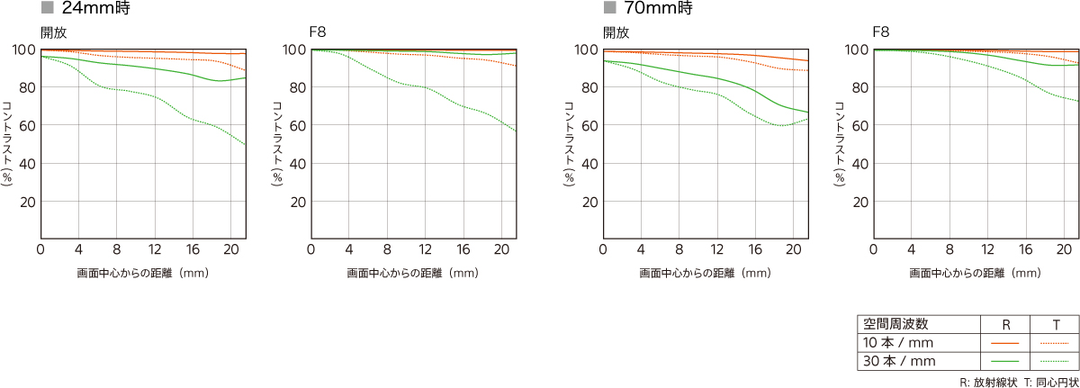 高解像度時代のボディの能力を最大限に発揮させるため、G Masterはクラス最高レベルの解像性能を目指し、従来よりも高い設計基準を設けて開発しています。たとえば、50本/mmのMTF曲線のように従来の周波数に加えより高い周波数の性能基準も設けています。こうした妥協のない取り組みが、高精細な被写体やシーンでも画像の隅々まで高いコントラストを保つ要因のひとつとなっています。