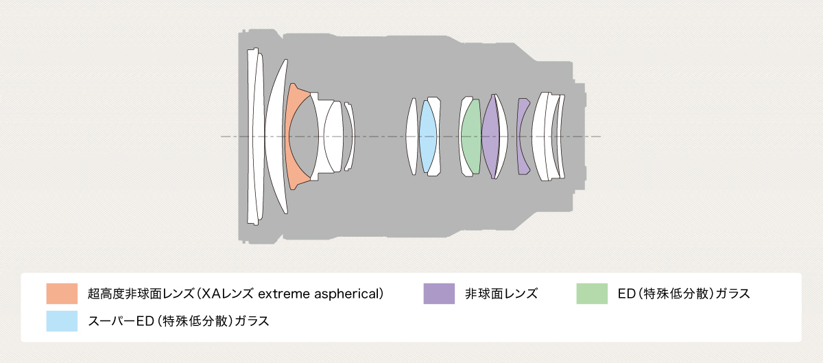 ED(特殊低分散)ガラス1枚とスーパーEDガラス1枚が色収差を良好に補正し、被写体を鮮鋭に描きます。また、被写体の輪郭の色づきや、ぼけ像の着色を効果的に低減することにより、自然で美しいぼけ味を実現しています。