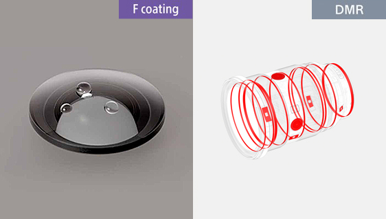 レンズ最前面に施したフッ素コーティングにより、レンズ表面に指紋、ほこり、水滴、油、泥などが付きにくく、付着しても簡単に取り除くことが可能です。