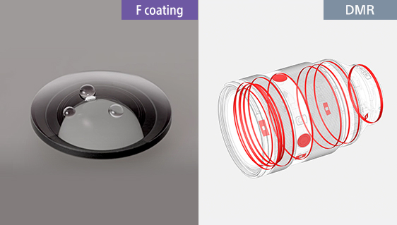 最前面のレンズに施したフッ素コーティングにより、レンズ表面に指紋、ほこり、水滴、油、泥などが付きにくく、付着しても簡単に取り除けます。