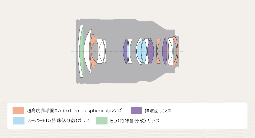 最新の光学設計と光学シミュレーション技術により、広角端28mmから望遠端70mmまでの、ズーム全域において単焦点に迫る(*)描写性能を実現。大口径の超高度非球面XA(extreme aspherical)レンズを3枚採用し、画面中央部から周辺部まで高い解像性能でのズーム全域開放F値2を成し遂げました。また、色収差を補正するために、スーパーEDガラス3枚とED(特殊低分散)ガラス1枚を最適に配置。画面中央部・画面周辺部での色収差を軽減し、解像度の低下を防ぎます。さらに、色のにじみが画像全体で効果的に抑制され、優れた明瞭さと解像度を実現しています。