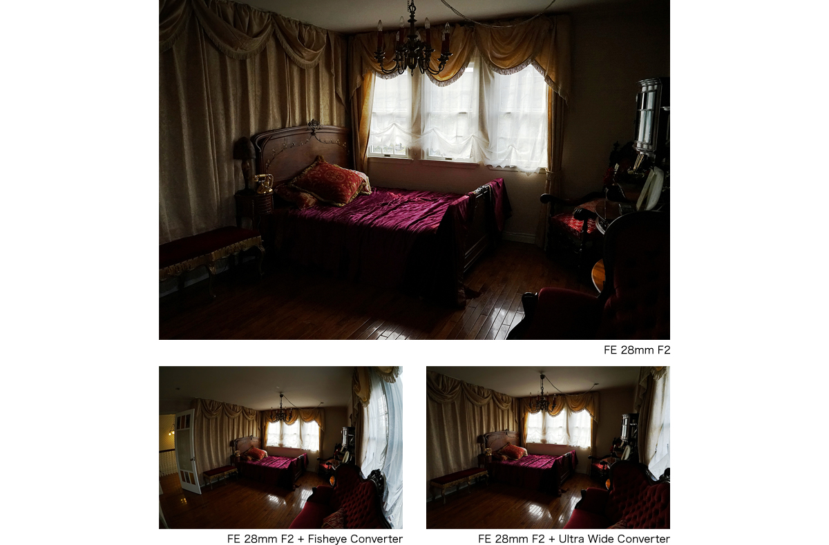 FE 28mm F2は、2種類のコンバーターレンズ(別売)に対応し、超広角・魚眼それぞれ異なる画角の撮影を手軽に楽しめます。フィッシュアイコンバーター装着時は、対角線画角180°という広い画角で、画面周辺に近づくほど画像が圧縮された魚眼レンズ特有のデフォルメ効果を楽しめます。ウルトラワイドコンバーター装着時は、焦点距離21mmの超広角描写が可能です。どちらも単体の交換レンズ相当の高い光学性能と、FE 28mm F2と一体感のある高品位なデザインを実現。さらに、コンバーター装着時は、自動でExif情報に反映されるためデータ管理も容易です。