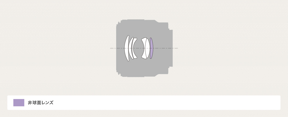 像面湾曲や歪曲収差を補正するため、優れたダブルガウス構成に非球面レンズ1枚を適切に配置。球面収差やコマ収差も良好に補正し、周辺性能を向上させています。