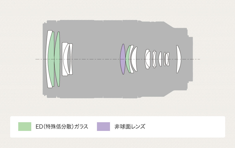 非球面レンズ1枚、EDガラス3枚を最適に配置。非球面レンズが球面収差を良好に補正し、ズーム全域で画面周辺部まで高い描写性能を発揮します。さらに、EDガラスにより超望遠撮影で目立ちやすい色収差を徹底的に抑制し、画面全域にわたりシャープな描写を実現します。
