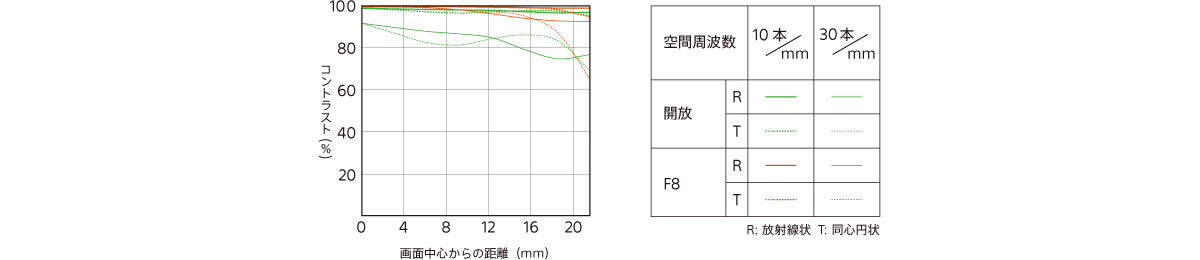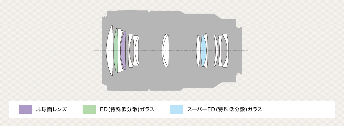 撮影距離の変化が大きいマクロレンズにおいて、近距離での収差変動を抑制し、フォーカス群の移動量を低減するフローティング機構(近距離収差補正機構)を採用。2つのフォーカスレンズ群を撮影距離に伴って移動させることで、遠距離だけでなく近距離でも、画面周辺まで鮮明な描写が得られます。また、フローティング機構の採用は、レンズの小型化にも貢献しています。