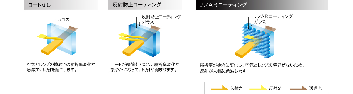 レンズの表面に入射した光は一定の割合で反射するため、その不要な反射光が画質を劣化させるフレアやゴーストの原因になります。ソニーが独自に開発したコーティング技術「ナノARコーティング」は、ナノサイズ(1ナノメートルは10億分の1メートル)の凸凹を規則的に並べた構造で、レンズ表面に境界面をなくして光の反射率を大幅に抑えます。このコーティングをレンズ面に施すことで、通常の反射防止コートと比較して約1/5という低い反射率を達成。不要な光の反射を極限まで低減し、内面反射によるフレアやゴーストを抑え、黒が締まったヌケの良いクリアな画質を実現しています。