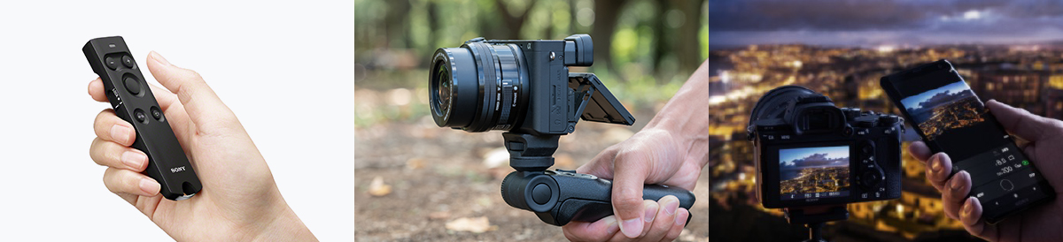別売りのワイヤレスのリモートコマンダー(RMT-P1BT)やシューティンググリップ(GP-VPT2BT)から容易にズーム操作できるほか、ジンバル撮影でも最新のImaging Edge Mobileアプリからリモートでスムーズな画角変更が可能です。
