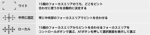15点のフォーカスエリアの中で自動的にピントを合わせる「ワイド」。画面中央のみでピントを合わせる「中央に固定」。15点からユーザーが任意にピントを合わせる位置を選べる「ローカル」。3種類の方法から、被写体や構図にあわせて選択できます。