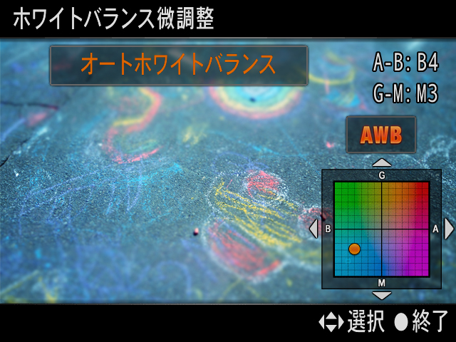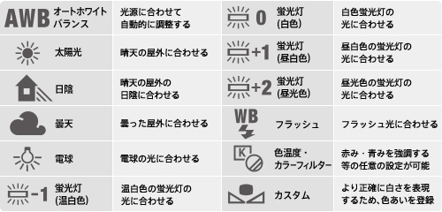 カメラがシーンの光源を自動で判定して、見たイメージに近い自然な色合いを再現する「AWB(オート)」モード。そのほかに「太陽光」「電球」「蛍光灯」などの光源に合わせて選べる6種のプリセットモードが選択できます。さらに、「色温度&カラーフィルター」や色合い微調整画面で、表現に合わせて色彩を細かく調整できます。より正確に白さを表現するため、色合いを登録して呼び出す「カスタム」モードもあります。