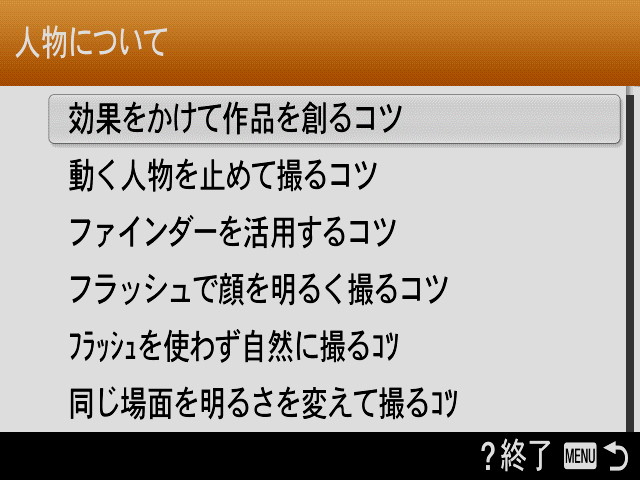機能や操作が分からないときには、「カメラ内ガイド」が便利です。操作に応じて各モードの説明や使い方をわかりやすく解説してくれるので、デジタル一眼カメラに慣れていなくても、迷うことなく操作できます。