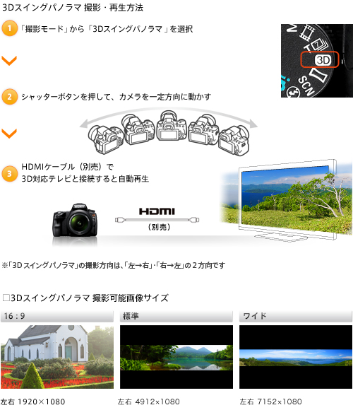 「スイングパノラマ」を活用して、3D写真を撮影できる「3Dスイングパノラマ」にも対応。カメラを一振りするだけで、画像を高速連写。カメラ内で左右の目の視差を計算しながら合成し、右目用と左目用の2枚の画像を同時に作成します。カメラと3D対応の〈ブラビア〉をHDMIケーブル(別売)で接続すれば、これまでにない立体感や奥行き感のある3D写真をテレビで鑑賞できます。