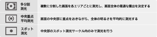 CMOSセンサーがとらえた画像を1200分割し、被写体の色や光の状況を細かく分析して高精度な測光を行います。測光モードは、各エリアの測光データをもとに適正な露出を決める「多分割測光」。知識や経験が生かせる「中央重点平均測光」、狙った部分だけを測光する「スポット測光」から、好みやシーンに合わせて選択できます。