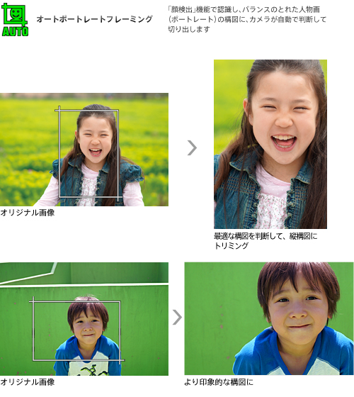 新たに開発された「オートポートレートフレーミング」機能を搭載。撮影時に画像を「顔検出」で認識し、バランスのとれた人物画(ポートレート)の構図になるように、カメラが自動で判断して切り出します。なにげなく普通に撮ってしまう写真も、より印象的な写真に仕上げ、誰もがプロのような構図でポートレートを手軽に撮影できます。また、切り出された画像は「全画素超解像技術」によりオリジナルと同じ解像感を保ちます。オリジナル画像も一緒に保存されるので、自分が取った構図とカメラが判断した構図を比べられ、ポートレート撮影における被写体の切り取りかたの参考にできます。