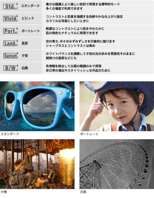 撮影シーンやイメージに合わせて、写真を仕上げられる「クリエイティブスタイル」機能。「スタンダード」「ビビッド」「ポートレート」「風景」「夕景」「白黒」の6種類のモードから選択すれば、カメラが最適な画像処理と調整を行います。さらにコントラスト、彩度、シャープネスを調整して好みに合わせて画像を仕上げられます。また動画撮影時にも、「クリエイティブスタイル」機能を設定できます。