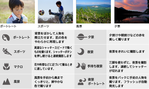 撮りたいシーンに合わせてモードを選ぶだけで、カメラが自動的に絞りやシャッタースピード、ホワイトバランスなどを設定します。「ポートレート」「風景」「マクロ」「スポーツ」「夕景」「夜景ポートレート」「夜景」「手持ち夜景」の8種類のモードから選択できます。